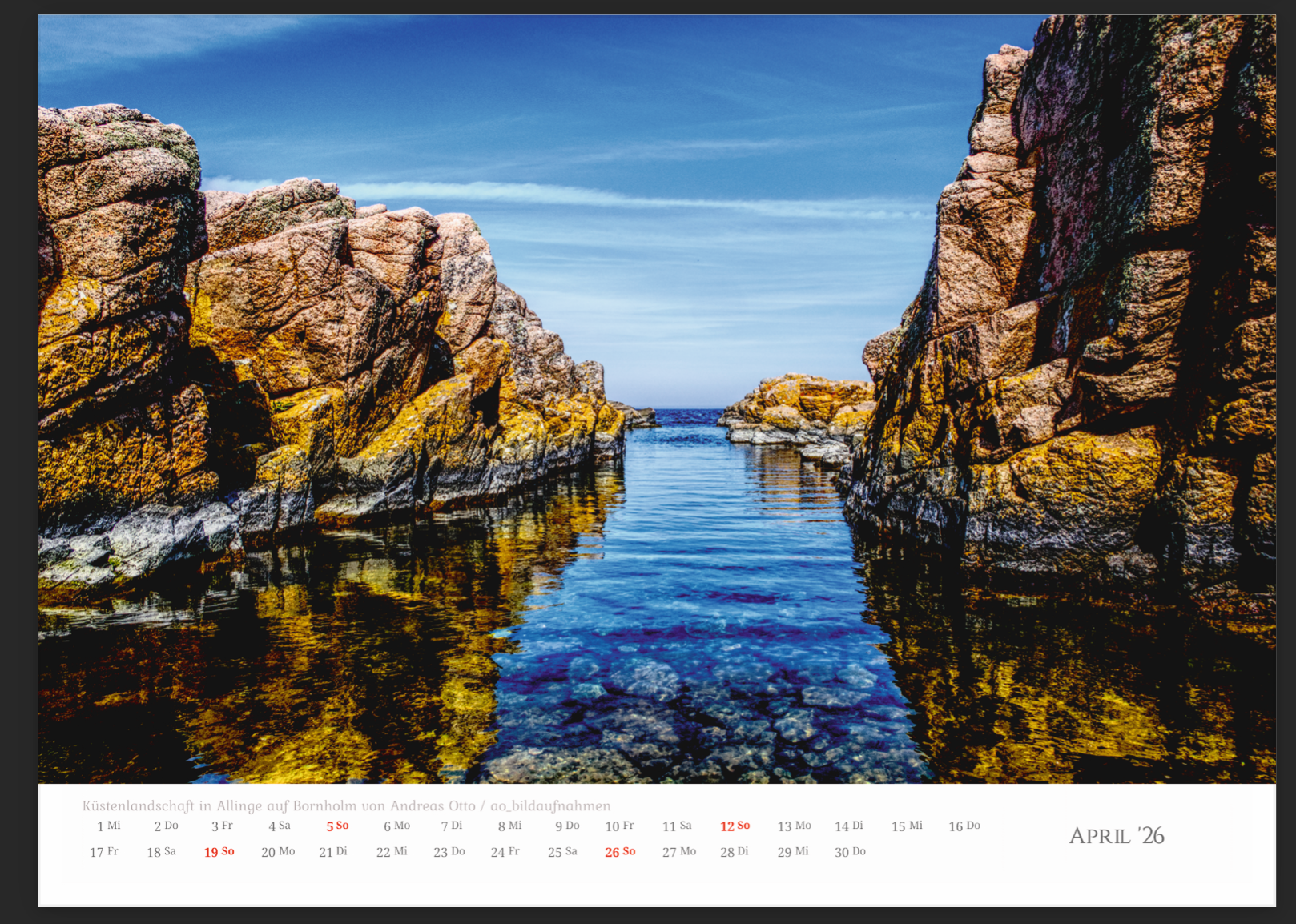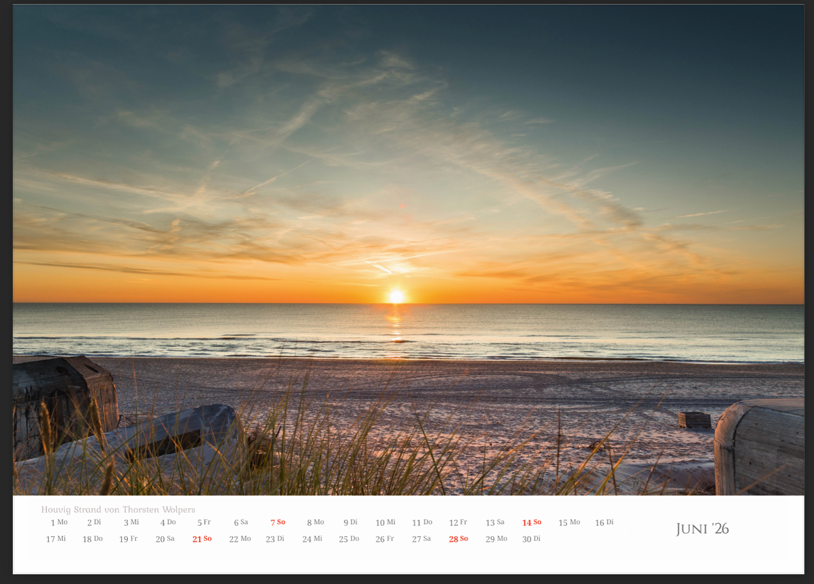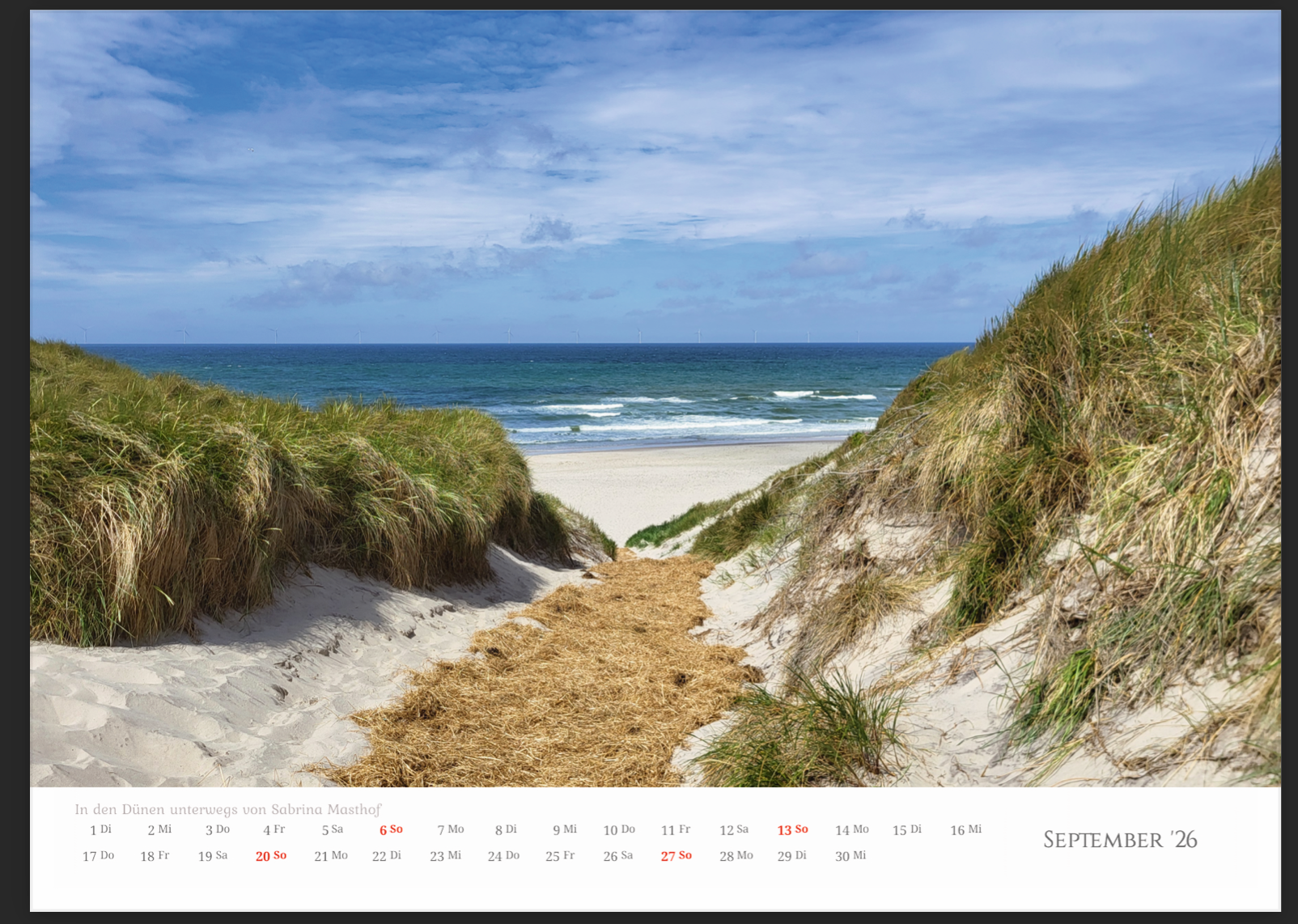 Jedes Monatsblatt begeistert mit einem hochwertigen, stimmungsvollen Foto aus verschiedenen Regionen Dänemarks – ideal für alle, die das nordische Lebensgefühl lieben oder sich gerne an ihren Urlaub am Meer erinnern.